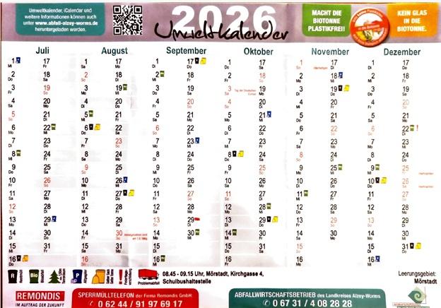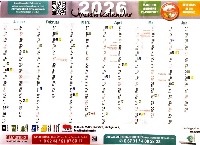 Problemabfälle (Sondermüll) kann einmal im Jahr in Mörstadt auf dem Rathausplatz entsorgt werden (in 2026 ist dies der 31.03.2026 und der 28.09.2026 von 8:45 bis 9:15 Uhr).